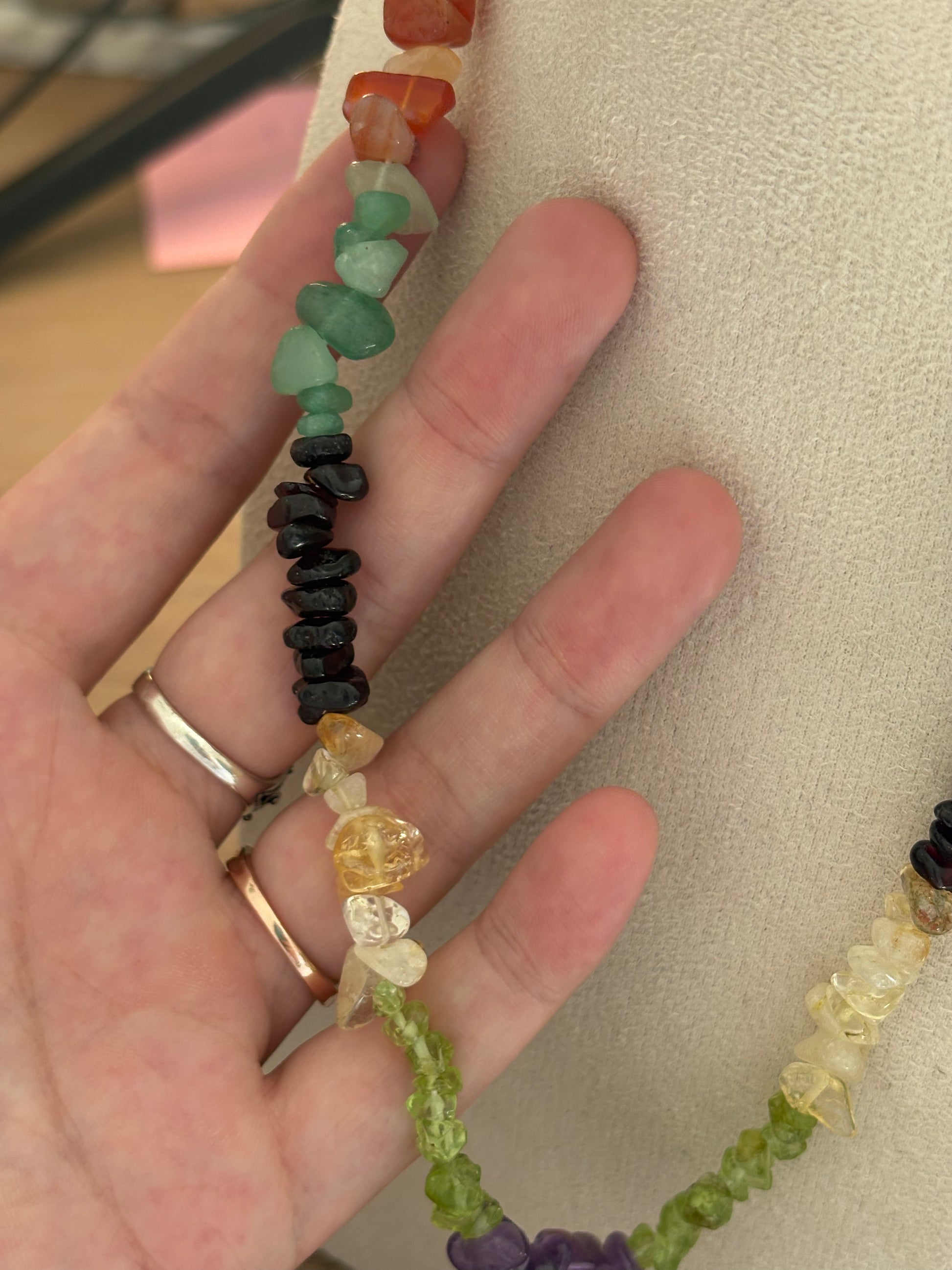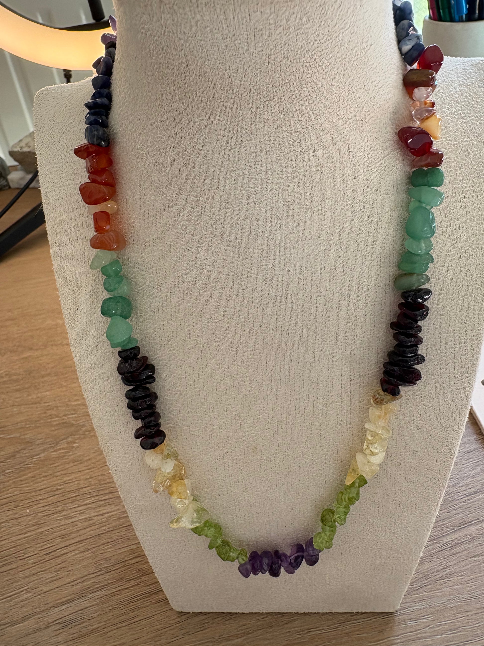 Ce magnifique collier est composé de pierres véritables soigneusement sélectionnées pour harmoniser et équilibrer les sept chakras. Chaque couleur correspond à un centre énergétique, favorisant ainsi le bien-être, l’ancrage et l’élévation spirituelle.