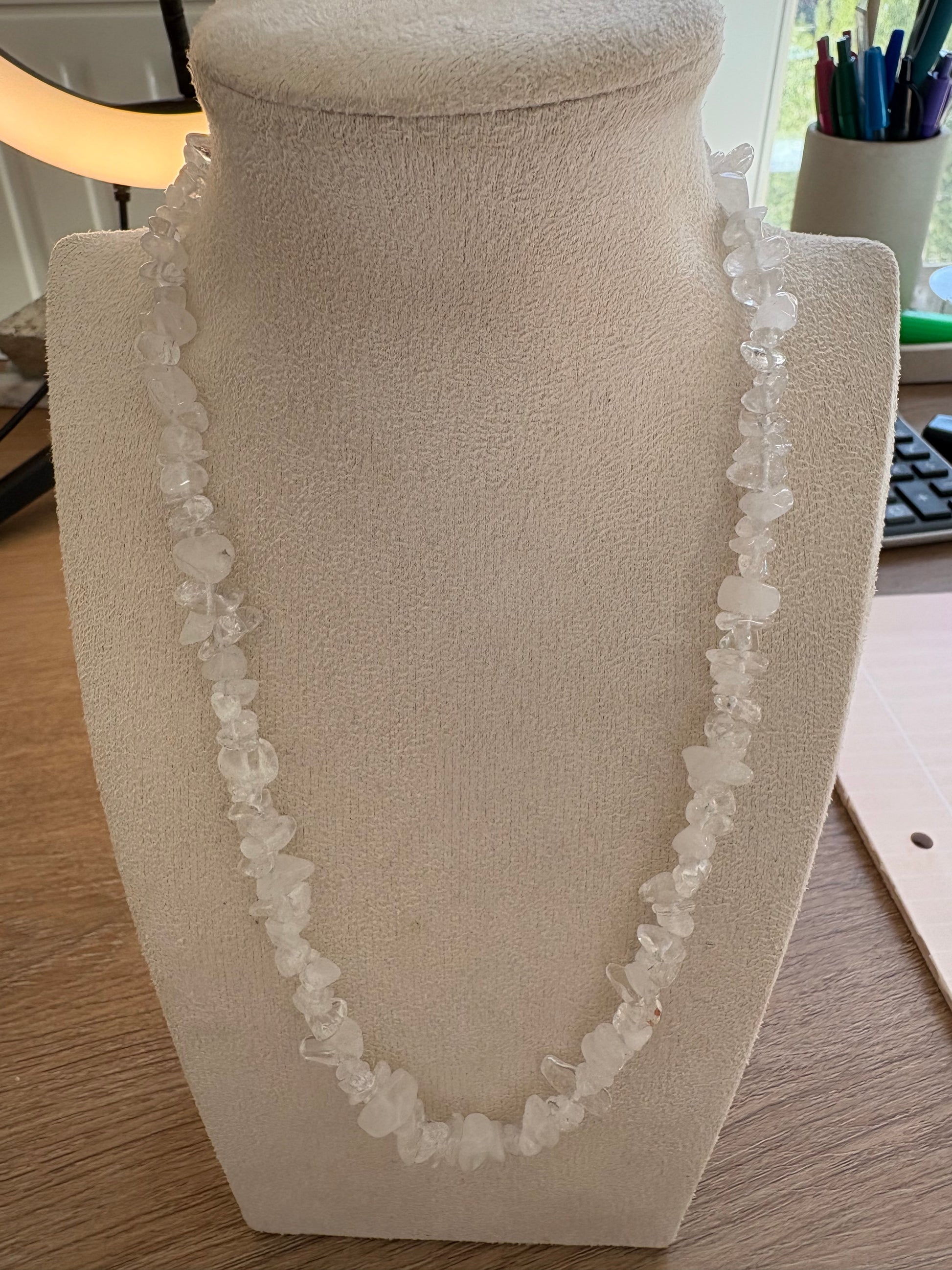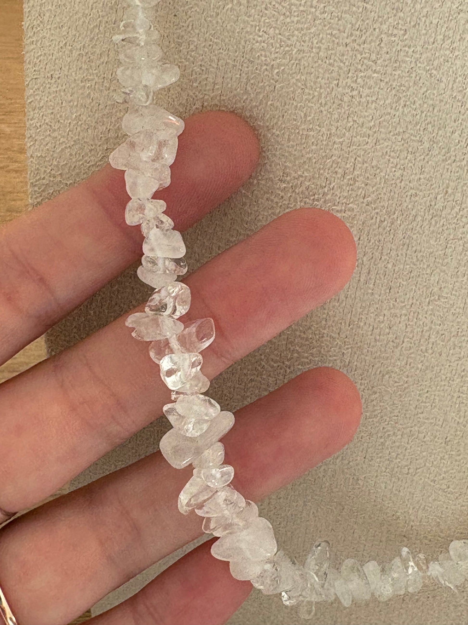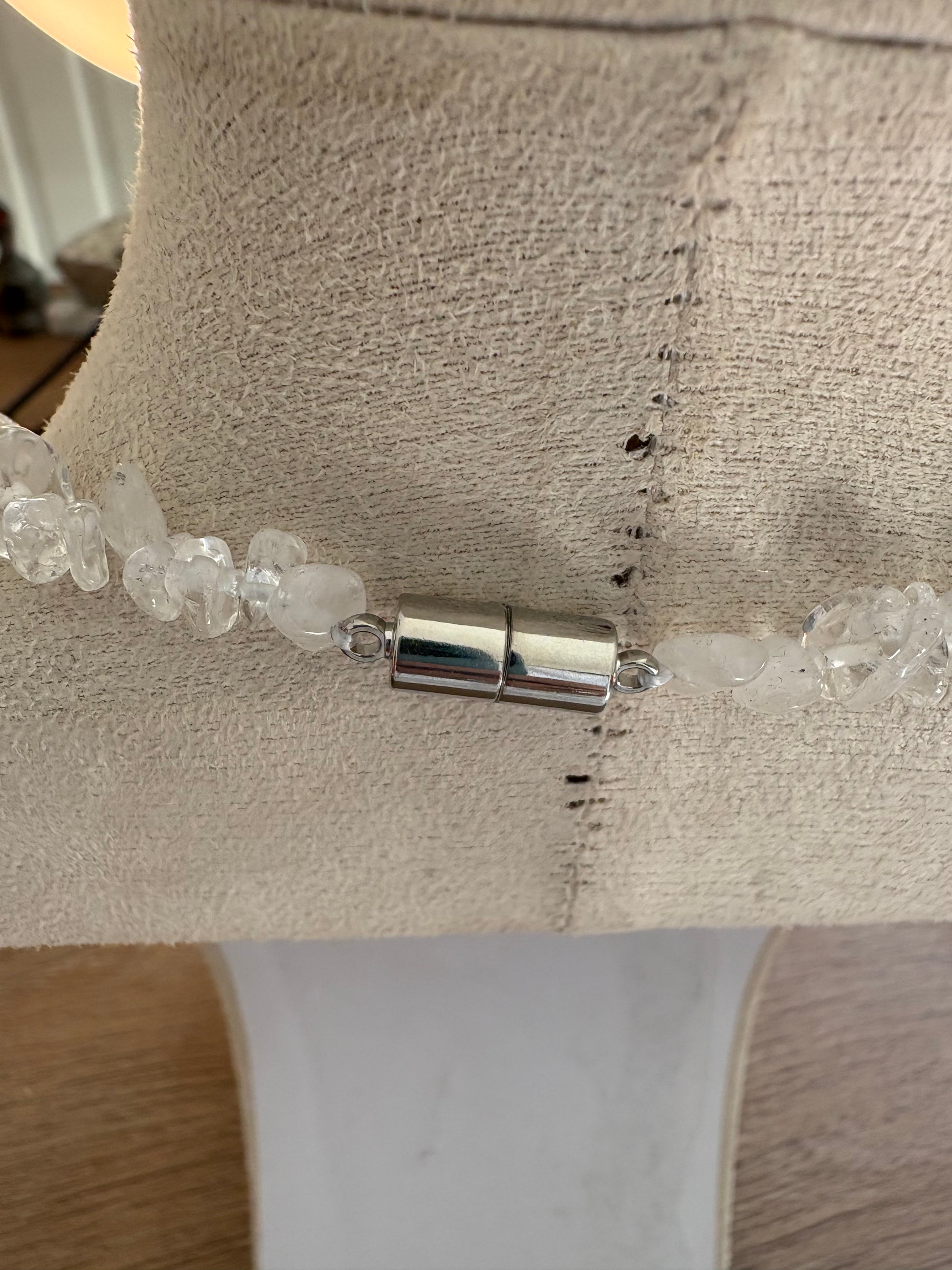 Ce collier est composé de véritables éclats de cristal de roche, pierre universelle et maîtresse en lithothérapie. Élégant et lumineux, il capte et diffuse la lumière, apportant pureté et équilibre à celui ou celle qui le porte.