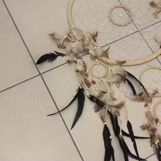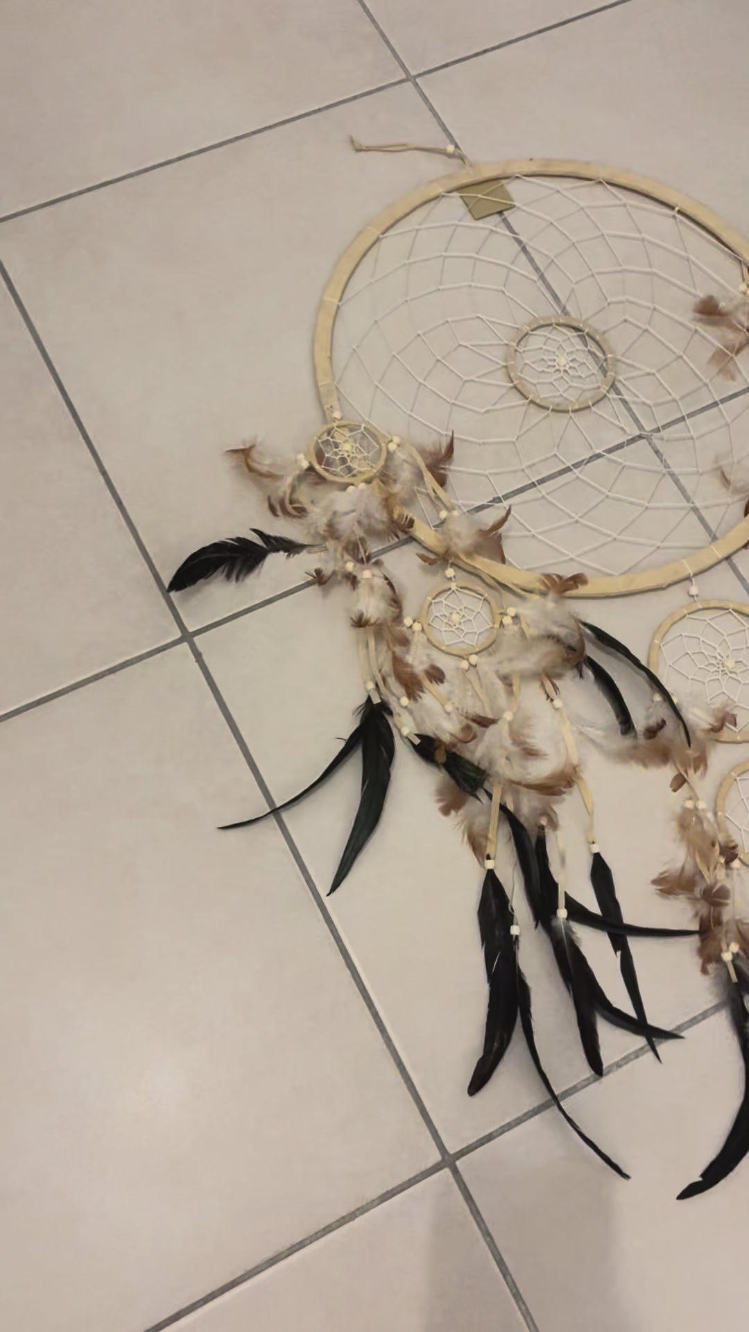 Voici un attrape-rêves indien d’environ 1 m de long sur 40 cm de large, de couleur beige avec des plumes noires. Vraiment, magnifique laissez-vous tenter.