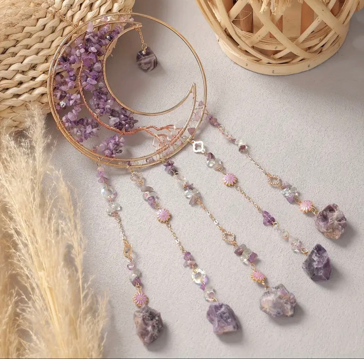 ✨ Attrape-rêves lune en améthyste – Pierre véritable ✨